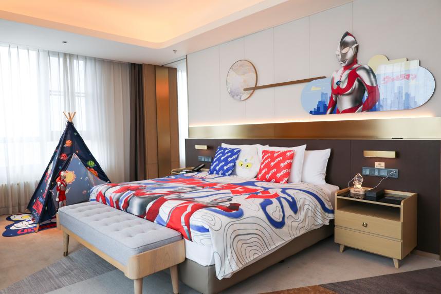 奥特曼主题房入住1晚:酒店将特定客房进行创意改造,融入奥特曼系列主题元素。从床品、墙饰、主题布置到欢迎礼品,全方位营造一个被“光之力量”包围的沉浸式入住环境,让每一位入住的孩子仿佛化身成为守护地球的小英雄,开启梦幻冒险。
