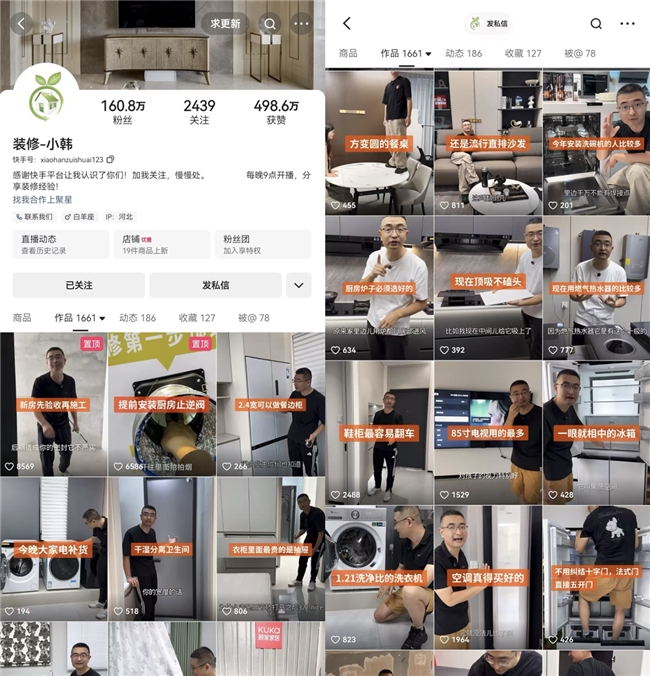 “2019年底,有位同行给我推荐了快手,说有很多人在上面分享做过的案例,可以拿给客户做参考”。在刷快手的过程中小韩发现,“有些家居家装的内容质量很不错”,但也有些人是在‘浑水摸鱼’”。抱着分享真实装修经验的想法,小韩决定尝试在快手创作些内容,“也希望能引流线下,提高签单率和利润”。