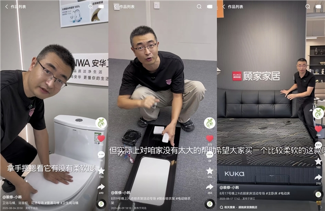 “新房装修一定要先做吊顶后粘瓷砖,这样做能够降低瓷砖的磨损……”直播间里,小韩又开始了他的装修答疑。与大多数电商主播的风格不同,小韩的短视频和直播内容很少会卖力宣传产品卖点,而是更多地讲经验、讲方法、讲技巧,甚至是讲装修和购买的顺序与尺寸,但他的“种草”效果却出奇的好,有用户可以在他直播间购买全套家电家居装备。